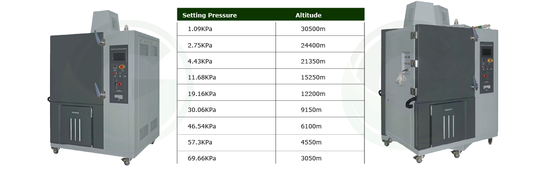 An automatically controlled vacuum system provides a precise altitude simulated condition up to 30000 meters. Available to connect the cable to the electronic performance test.