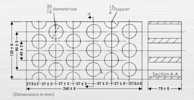 Cover the gasoline plate with refractory baffles. Keep the test object in this condition for 60 seconds. Alternatively, by mutual consent, the test object continues to be exposed directly to the flame for another 60 seconds. The refractory baffles are made of standard refractory bricks. The sieve hole size is shown in the figure below. Refractory can also be made with reference to this size.