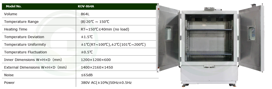 KOV-864A Industrial drying oven uses ventilation system to introduce ambient air (when the best room temperature is less than 30°C) to cool down. This is a customized oven with a customized white color. The double doors are designed to accommodate a larger testing area, and the two observation windows facilitate observation of sample testing.