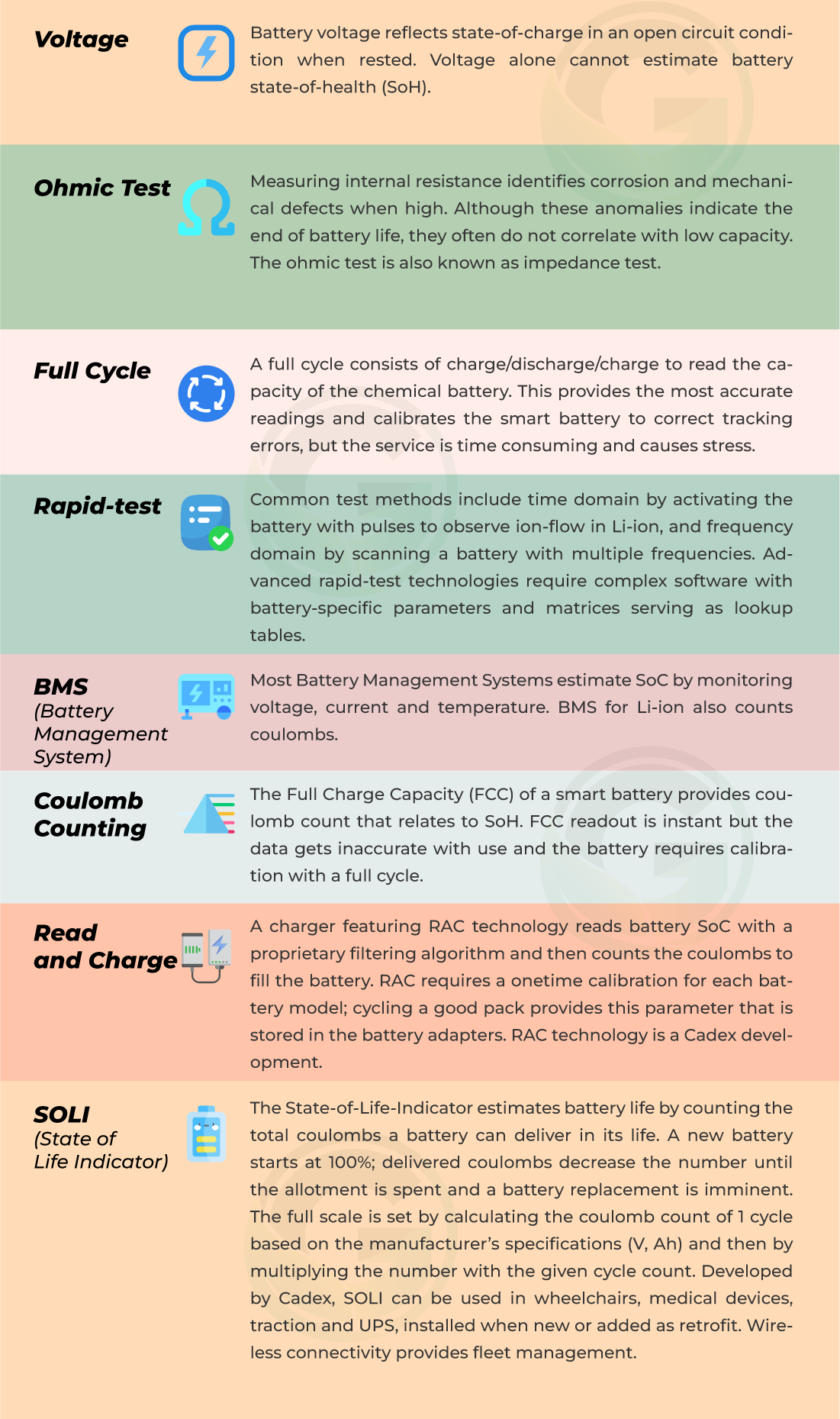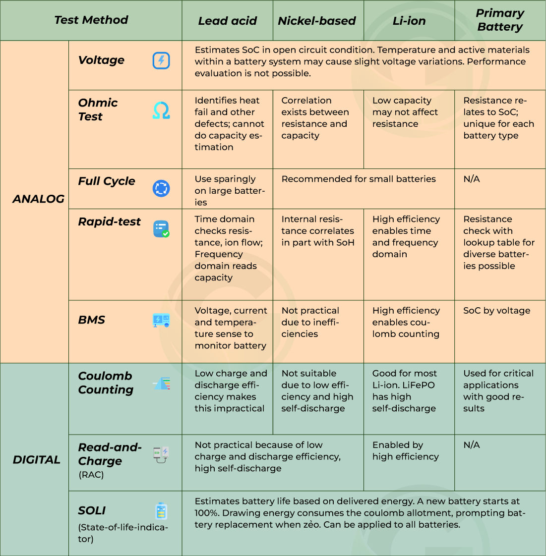 The table below summarizes test procedures with the most common battery systems. Lead acid and Li-ion share communalities in keeping low resistance under normal condition. Exceptions are heat fail and mechanical faults that raise the internal resistance and a battery replacement ahead of time. Nickel-cadmium and nickel-metal-hydride, and in part also the primary battery, reveal the end-of-life.