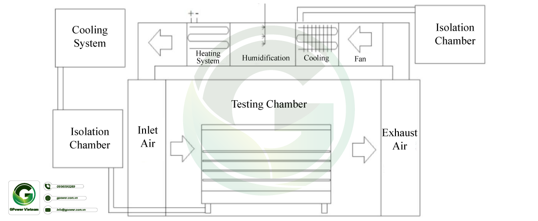 A temperature and humidity testing chamber generates controlled environmental conditions. The air and water supplied to the chamber are passed through cooling and heating systems to meet specific standards before entering the testing chamber. Inside the testing chamber, environmental parameters, including air velocity, are continuously maintained and monitored. Feedback from sensors is sent to the control system to promptly issue appropriate adjustment commands.