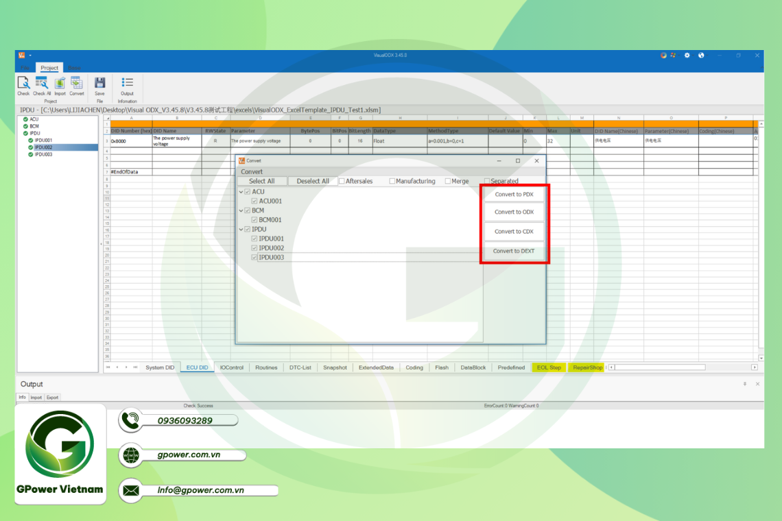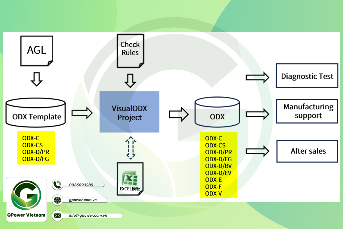 - • Load ODX templates and Excel diagnostic questionnaires through VisualODX to generate standard ODX/PDX/CDD/DEXT databases (which can be used in later stages of development, testing, production and after-sales)